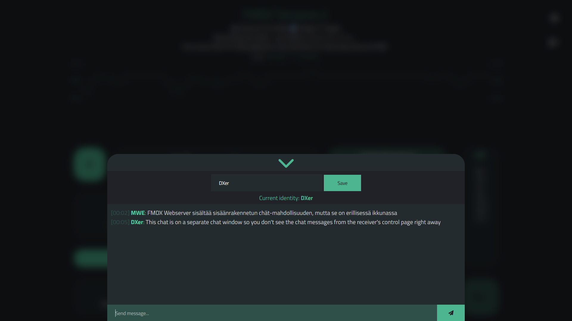 FM-DX Webserver's chat window opens separately from the chat button, and the actual user interface remains in the background. |